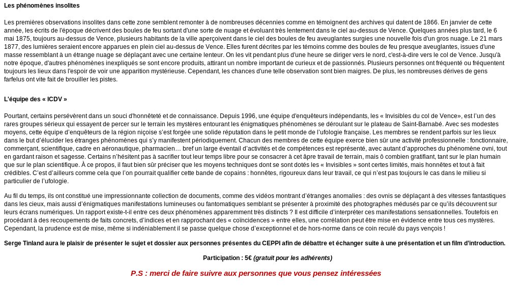 Le CEPPI ( Centre dEtudes Parapsychologiques et des Phénomènes Inexpliqués) nous a invité pour faire une conférence sur nos activités ufologiques à Nice . Serge parlera aussi du projet phénix.