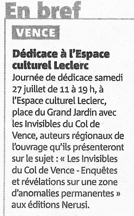 A noter par ailleurs, qu'il y a eu un encadré dans le nice-matin du vendredi 26 juillet pour signaler cette journée dédicace.