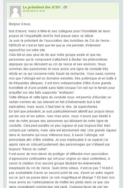 Une fois de plus les Invisibles du Col de Vence – I.C.D.V. ont été les cibles désignées de ce qu’il faut appeler une attaque à peine voilée de la part de M. J.M.Grandsire sur le site UFOFU. Nous ne sommes pas naïfs. L’emploi du mot « invisibles » a été plusieurs fois employé à dessein dans plusieurs mails émanant de plusieurs personnes, dont M. Grandsire qui a été, et de loin, le plus virulent. La ficelle est grosse et l’allusion à notre groupe est patente.