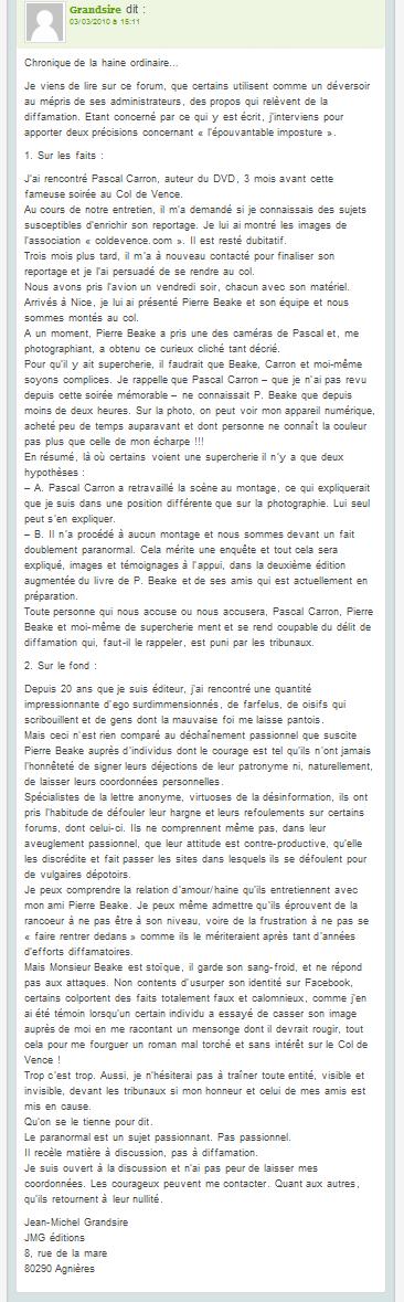 Afin que les choses soient claires pour tout le monde, vous trouverez joint à ce mail copie de notre courrier à M.Grandsire. L’affaire qui nous a opposée n’est pas anodine. Il s’agissait purement et simplement d’une question de plagiat, et pour être plus précis d’un quasi « copier-coller » de la couverture de notre livre paru en octobre 2008 sous le titre « Les Invisibles du col de Vence / Enquêtes et révélations sur une zone d’anomalies permanentes ». M.Grandsire a sagement obtempéré et fait le nécessaire afin que cette irrégularité soit corrigée. Il n’a jamais été question de faire interdire la publication de ce livre mais de faire rectifier la grosse bourde qu’un vrai professionnel de l’édition ne devrait jamais commettre. Toutefois la Justice de notre pays qui nous protège tous de ce genre de méfait nous permet effectivement, en cas ne non-coopération de la partie adverse, de poursuivre devant les tribunaux le ou les contrevenants.