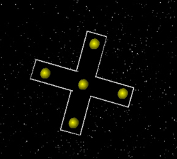 Le plus étonnant est la disposion de ces lumières: en carré avec 1 lumière à chaque coin et la cinquième au centre. On pourrait également comparer cette dispotion à un X avec les distances entre chaque spots équivalentes. Je passe les jumelles à mon ami Mirko qui constate la même chose.