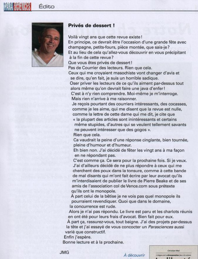 Déjà dans un numéro de « Parasciences » paru il y quelques mois, M. J.M. Grandsire, dans son édito, revenait sur un épisode assez malheureux dont il a été soi-disant la victime, et cela en des termes insultants et même diffamatoires à notre encontre. Nous en fûmes surpris et assez déçus, pensant que cette affaire regrettable était définitivement réglée. Non content de s’en être tiré finalement avec peu de dégâts malgré la grave erreur d’appréciation qu’il a commise et que nous lui avons signalé par voie officielle légale (courrier d’avertissement de notre avocat), ce monsieur en remettait une couche en nous qualifiant de mal disant et de charlots voulant conserver un monopole (?!) sur le Col de Vence.