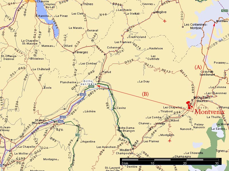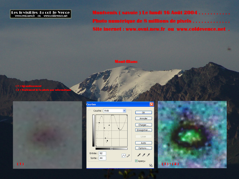 Voici une photo prise en direction du Mont-Blanc, le lundi 16 Août 2004. Une bien belle journée sans nuage, qui méritait une photo du plus haut sommet des alpes (4807 m) . Le résultat est une bien belle « photo surprise », et comme d'habitude rien n'est visible avant, pendant et après la prise de vue. D'autres photos vont suivre tout au long de mes vacances, sans que je me doute de quoi que ce soi. Il n'y avait aucune raison de chercher des anomalies sur mes photos car Montvenix est un petit village savoyard, et non le col de vence, qui, est un endroit connu pour ses manifestions. De retour de vacances, j'ai reçu, par la poste, l'excellente revue à laquelle je suis abonné “ Lumières dans la Nuit” éditée par Joël Mesnard. Que fut mon étonnement de voir en première page l'annonce d'un article sur Gilly-sur-Isère, qui est à une trentaine de kilomètres à vol d'oiseau du village où j'ai passé mes vacances . M. Paul Reydet a obtenu, le 4 septembre 2004, à 19 h 46, une remarquable photo surprise. « voir couverture de la revue n°375 » qui met en évidence , un objet ( cf article p36 ). D'une forme sombre, elliptique, environ 3 fois plus longue que large. M Reydet est affirmatif : il n'a rien remarqué au moment où il a pris la photo. Etrange ressemblance, qui me rappelle le col de vence. J'ai de nouveau regardé mes photos de vacances, et sur certaines en ressort des anomalies. La photo que je vous expose fait partie de celles-là. Bien étrange forme ! car la photo fut doublée et sur la deuxième il n'y apparaît rien !, Après un léger traitement informatique, cette forme laisse apparaître un anneau de couleur noire autour d'un semblant d'objet de couleur verdâtre. A vous de juger et de vous faire votre propre opinion. Si vous habitez la région, ou y avez séjourné pendant vos vacances, vous avez vous aussi, peut-être, la chance d'avoir une ou plusieurs photos surprises…à suivre.